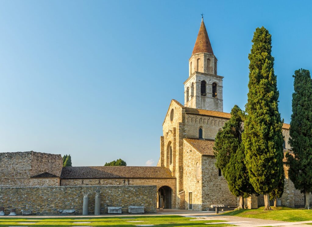 Aujourd’hui, vous traversez la Vénétie et le Frioul-Vénétie Julienne, une région où rivières, canaux et vestiges romains racontent des siècles d’histoire. En chemin, vous pouvez faire un détour par Palmanova, surnommée « la ville étoilée », dont le plan en étoile à neuf branches se découvre parfaitement depuis les hauteurs. La route vous mène ensuite à Aquileia, célèbre pour ses fouilles archéologiques romaines et ses mosaïques antiques.