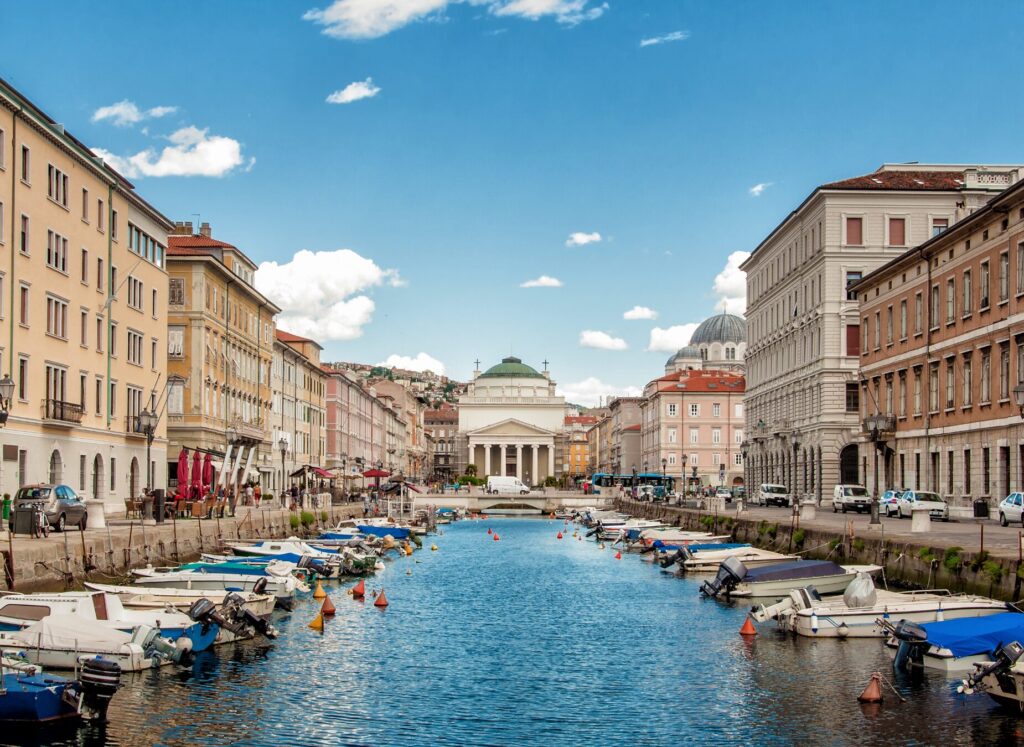 Retour progressif vers la mer en direction du golfe de Trieste. En chemin, vous traversez Duino et ses châteaux, la baie de Sistiana, puis longez le château de Miramare. L’arrivée à Trieste marque un changement d’ambiance, entre influences italiennes et héritage austro-hongrois.