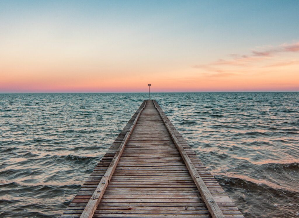 Station balnéaire historique accessible par une longue digue sur la lagune.