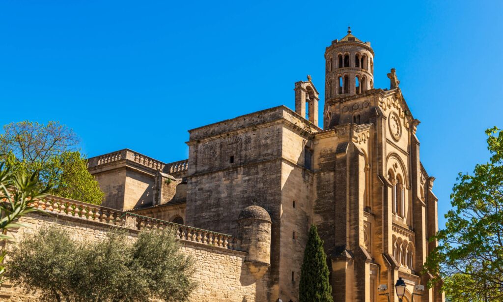 La route traverse les paysages ouverts de la vallée d’Uzès, entre villages de pierre blanche, domaines viticoles et garrigues parfumées de thym.