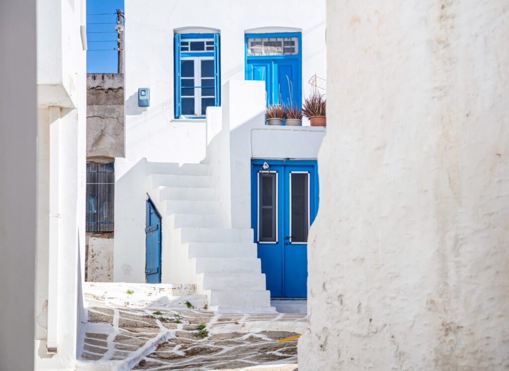 Le relief des Cyclades est vallonné à parfois montagneux, les routes principalement asphaltées. Les îles se ressemblent et se distinguent à la fois : même architecture de maisons blanches aux volets bleus, mêmes criques turquoise et ruelles fleuries, mais chacune garde son caractère propre. Ports de pêche traditionnels, monastères byzantins accrochés aux falaises, sanctuaires antiques dominant la mer, vestiges d’une histoire qui remonte à plus de 5 000 ans.