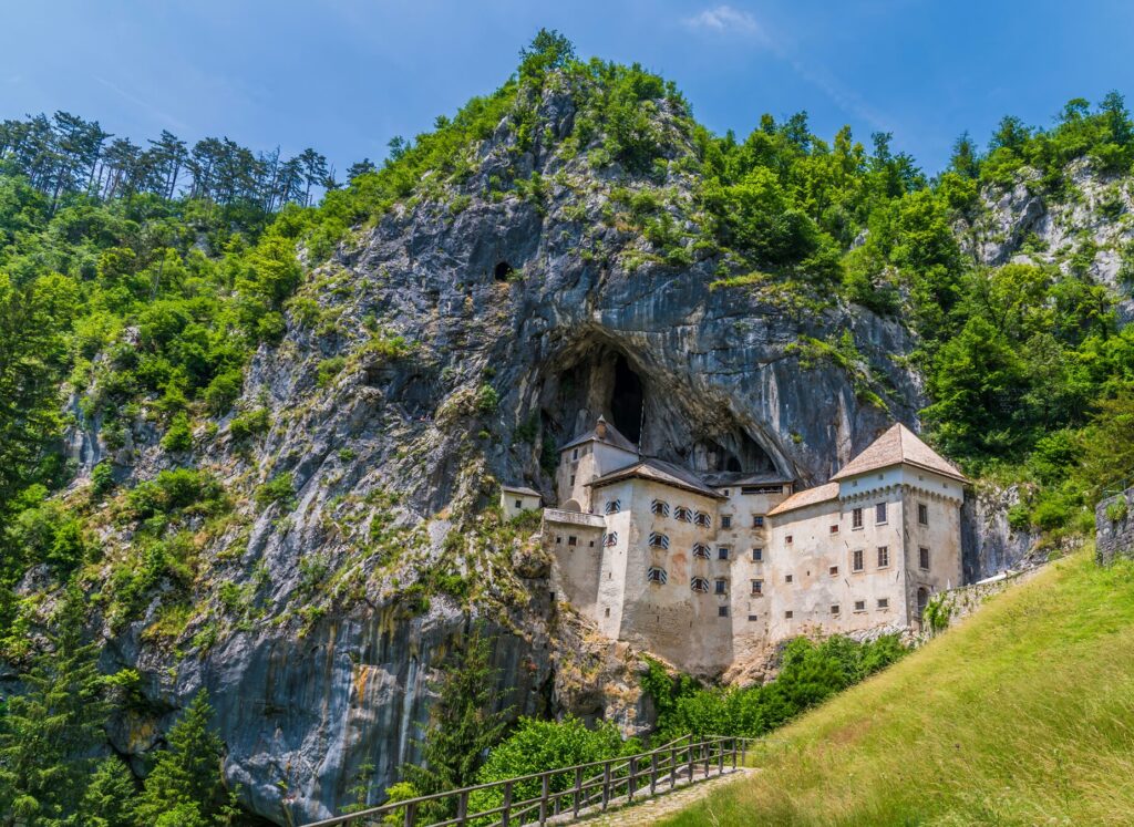 En chemin, possibilité de faire un détour vers le château de Predjama, forteresse médiévale construite à flanc de falaise et associée à la figure d’Erasmus, chevalier rebelle du XVe siècle. L’itinéraire se poursuit dans un environnement plus minéral jusqu’à Postojna, connue pour son vaste réseau de grottes.
